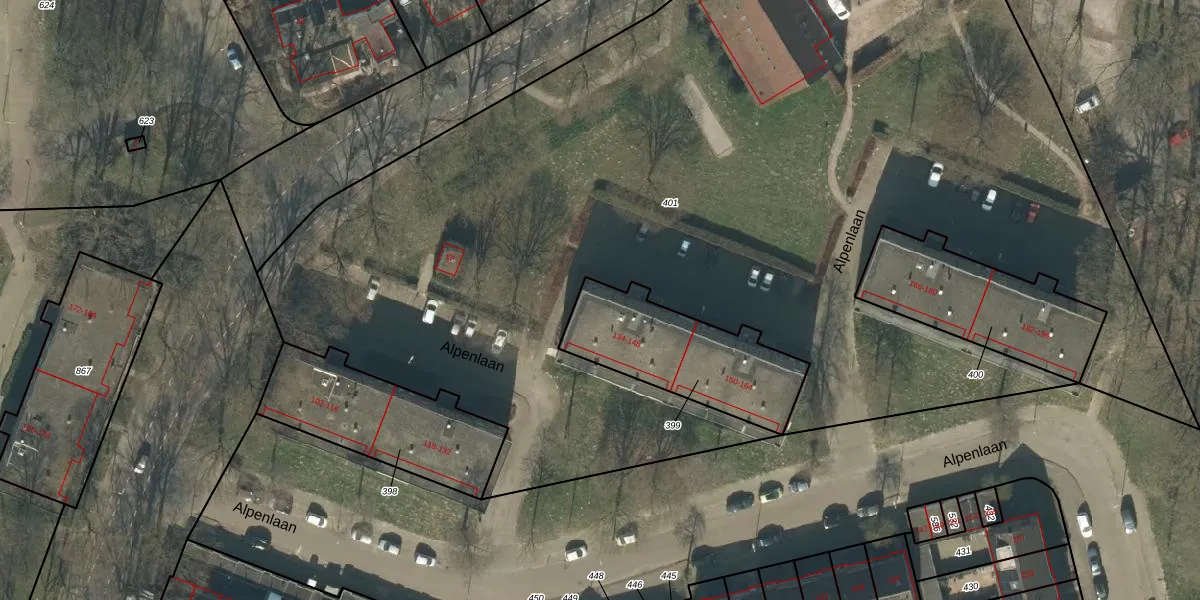 Het perceel waarop Alpenlaan 134 staat heeft een oppervlakte van 526 m². Dit is een groot perceel. De perceeloppervlakte wordt geregistreerd door het Kadaster. Gedetailleerde informatie over de maten van dit perceel kunt u vinden in het rapport Kadastrale kaart met maatvoering van Alpenlaan 134.
