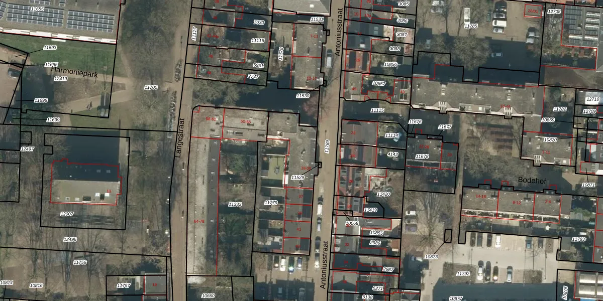Het perceel waarop Antoniusstraat 23 staat heeft een oppervlakte van 846 m². Dit is een groot perceel. De perceeloppervlakte wordt geregistreerd door het Kadaster. Gedetailleerde informatie over de maten van dit perceel kunt u vinden in het rapport Kadastrale kaart met maatvoering van Antoniusstraat 23.