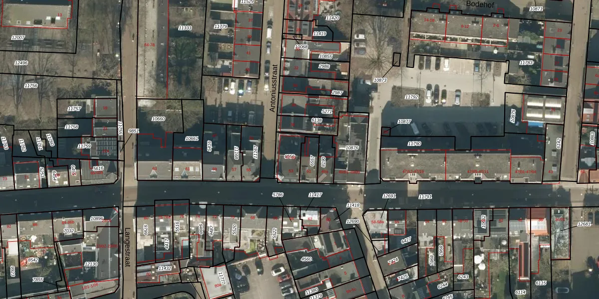Antoniusstraat 46 is gelegen op kadastraal perceel TBG01M6556. Deze kadastrale aanduiding is uniek en wordt gebruikt door het Kadaster om eigendomsrechten en andere zakelijke rechten vast te leggen. Het perceel maakt onderdeel uit van de kadastrale gemeente Tilburg.