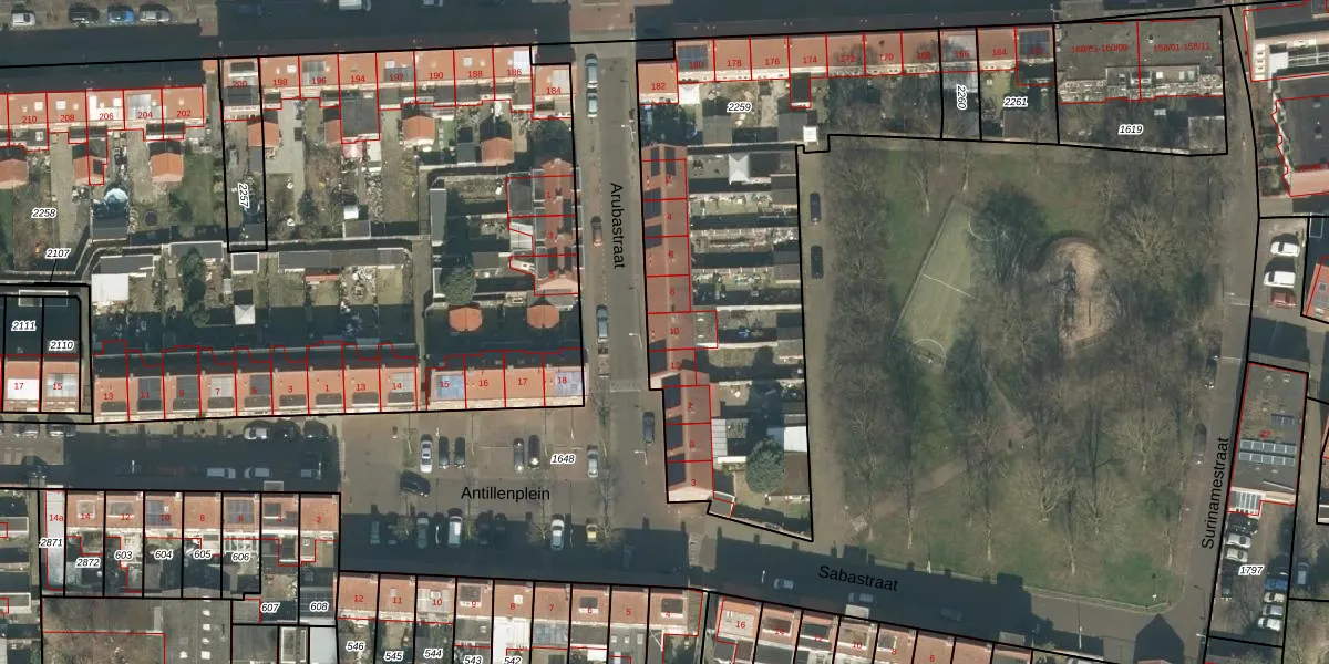 Het perceel waarop Arubastraat 10 staat heeft een oppervlakte van 2017 m². Dit is een zeer groot perceel. De perceeloppervlakte wordt geregistreerd door het Kadaster. Gedetailleerde informatie over de maten van dit perceel kunt u vinden in het rapport Kadastrale kaart met maatvoering van Arubastraat 10.