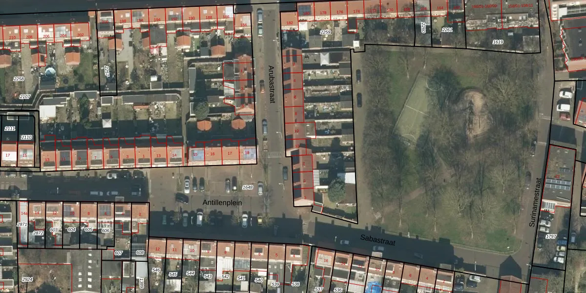 Het perceel waarop Arubastraat 12 staat heeft een oppervlakte van 2017 m². Dit is een zeer groot perceel. De perceeloppervlakte wordt geregistreerd door het Kadaster. Gedetailleerde informatie over de maten van dit perceel kunt u vinden in het rapport Kadastrale kaart met maatvoering van Arubastraat 12.