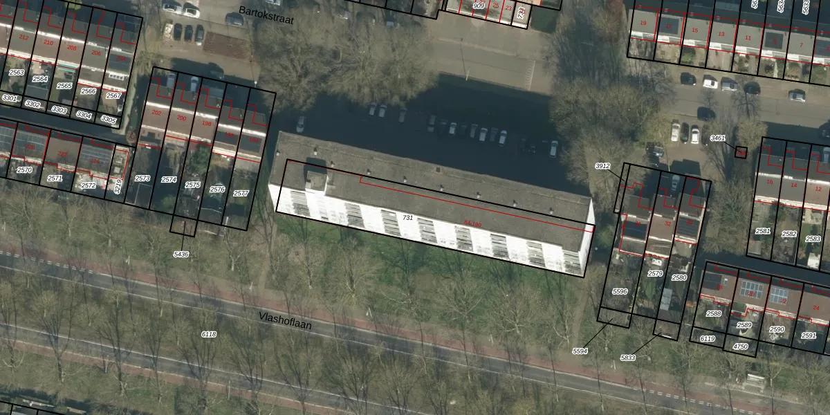 Het perceel waarop Bartokstraat 166 staat heeft een oppervlakte van 979 m². Dit is een groot perceel. De perceeloppervlakte wordt geregistreerd door het Kadaster. Gedetailleerde informatie over de maten van dit perceel kunt u vinden in het rapport Kadastrale kaart met maatvoering van Bartokstraat 166.