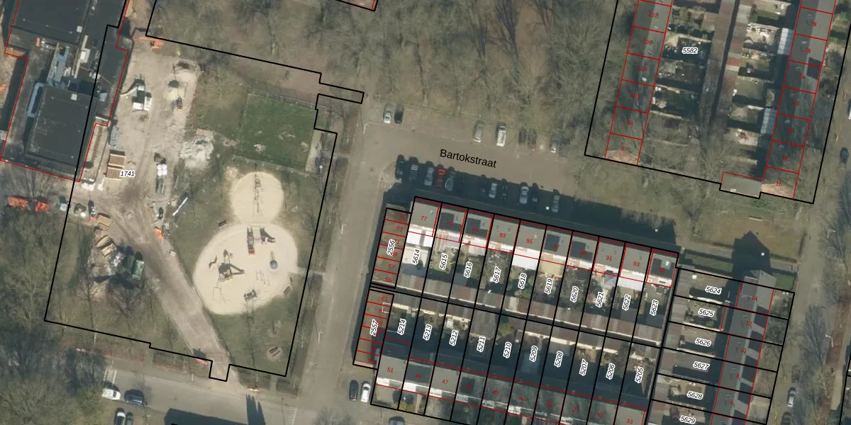 Bartokstraat 77 is gelegen op kadastraal perceel TBG01S5614. Deze kadastrale aanduiding is uniek en wordt gebruikt door het Kadaster om eigendomsrechten en andere zakelijke rechten vast te leggen. Het perceel maakt onderdeel uit van de kadastrale gemeente Tilburg.