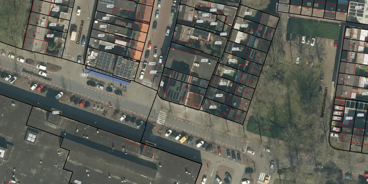 Het perceel waarop Beethovenlaan 265-d staat heeft een oppervlakte van 302 m². Dit is een groot perceel. De perceeloppervlakte wordt geregistreerd door het Kadaster. Gedetailleerde informatie over de maten van dit perceel kunt u vinden in het rapport Kadastrale kaart met maatvoering van Beethovenlaan 265-d.