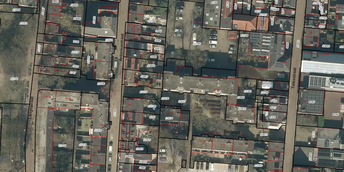 Het perceel waarop Bodehof 33 staat heeft een oppervlakte van 1065 m². Dit is een zeer groot perceel. De perceeloppervlakte wordt geregistreerd door het Kadaster. Gedetailleerde informatie over de maten van dit perceel kunt u vinden in het rapport Kadastrale kaart met maatvoering van Bodehof 33.