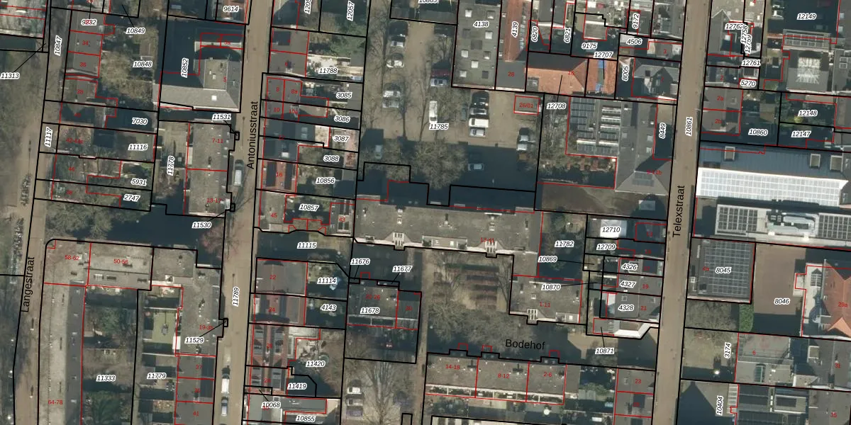 Het perceel waarop Bodehof 39 staat heeft een oppervlakte van 1065 m². Dit is een zeer groot perceel. De perceeloppervlakte wordt geregistreerd door het Kadaster. Gedetailleerde informatie over de maten van dit perceel kunt u vinden in het rapport Kadastrale kaart met maatvoering van Bodehof 39.