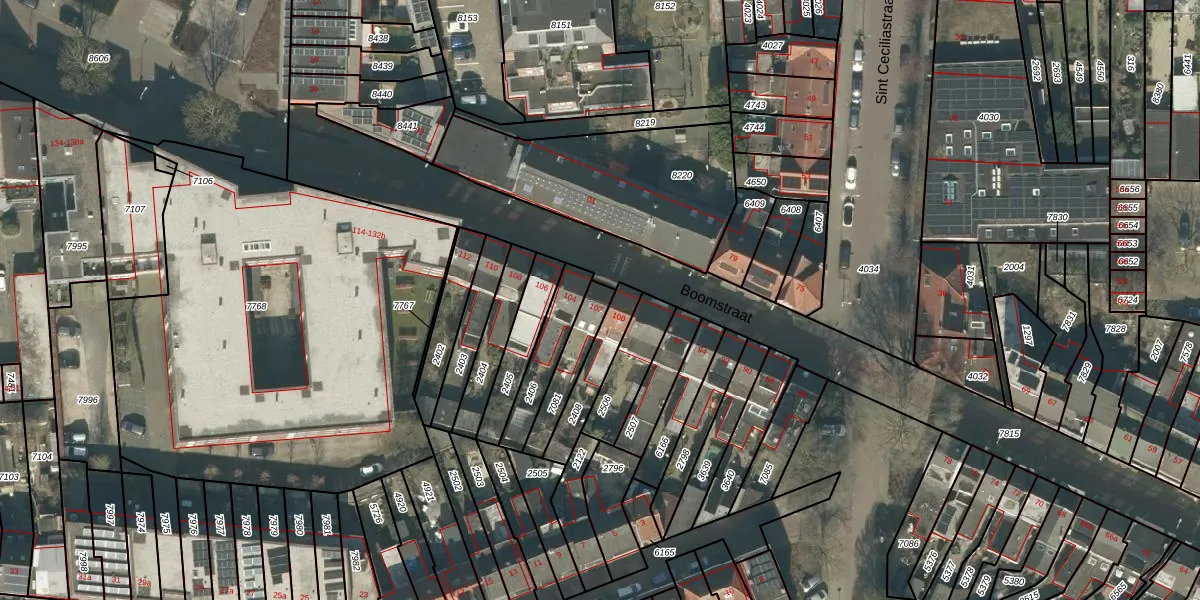 Boomstraat 102 is gelegen op kadastraal perceel TBG01P7081. Deze kadastrale aanduiding is uniek en wordt gebruikt door het Kadaster om eigendomsrechten en andere zakelijke rechten vast te leggen. Het perceel maakt onderdeel uit van de kadastrale gemeente Tilburg.