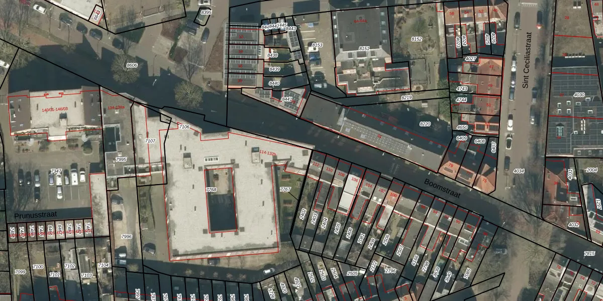 Boomstraat 114 is gelegen op kadastraal perceel TBG01P7768. Deze kadastrale aanduiding is uniek en wordt gebruikt door het Kadaster om eigendomsrechten en andere zakelijke rechten vast te leggen. Het perceel maakt onderdeel uit van de kadastrale gemeente Tilburg.