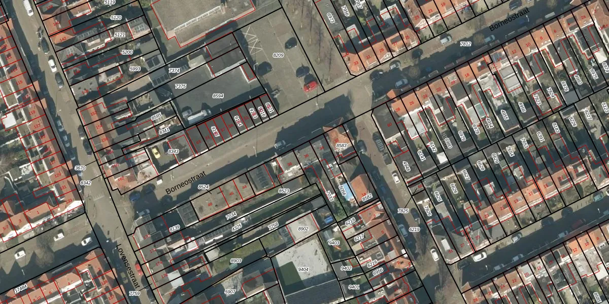 Borneostraat 36 is gelegen op kadastraal perceel TBG01B7033. Deze kadastrale aanduiding is uniek en wordt gebruikt door het Kadaster om eigendomsrechten en andere zakelijke rechten vast te leggen. Het perceel maakt onderdeel uit van de kadastrale gemeente Tilburg.