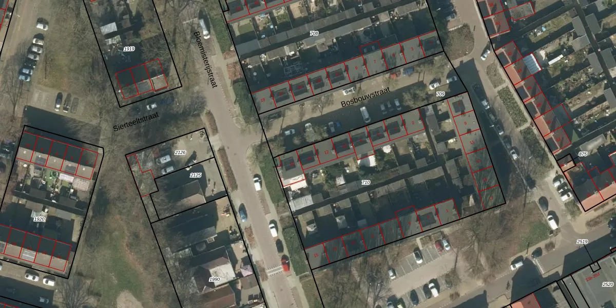 Het perceel waarop Bosbouwstraat 14 staat heeft een oppervlakte van 2567 m². Dit is een zeer groot perceel. De perceeloppervlakte wordt geregistreerd door het Kadaster. Gedetailleerde informatie over de maten van dit perceel kunt u vinden in het rapport Kadastrale kaart met maatvoering van Bosbouwstraat 14.