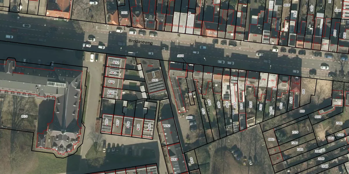 Bredaseweg 202-03 is gelegen op kadastraal perceel TBG01P1653. Deze kadastrale aanduiding is uniek en wordt gebruikt door het Kadaster om eigendomsrechten en andere zakelijke rechten vast te leggen. Het perceel maakt onderdeel uit van de kadastrale gemeente Tilburg.