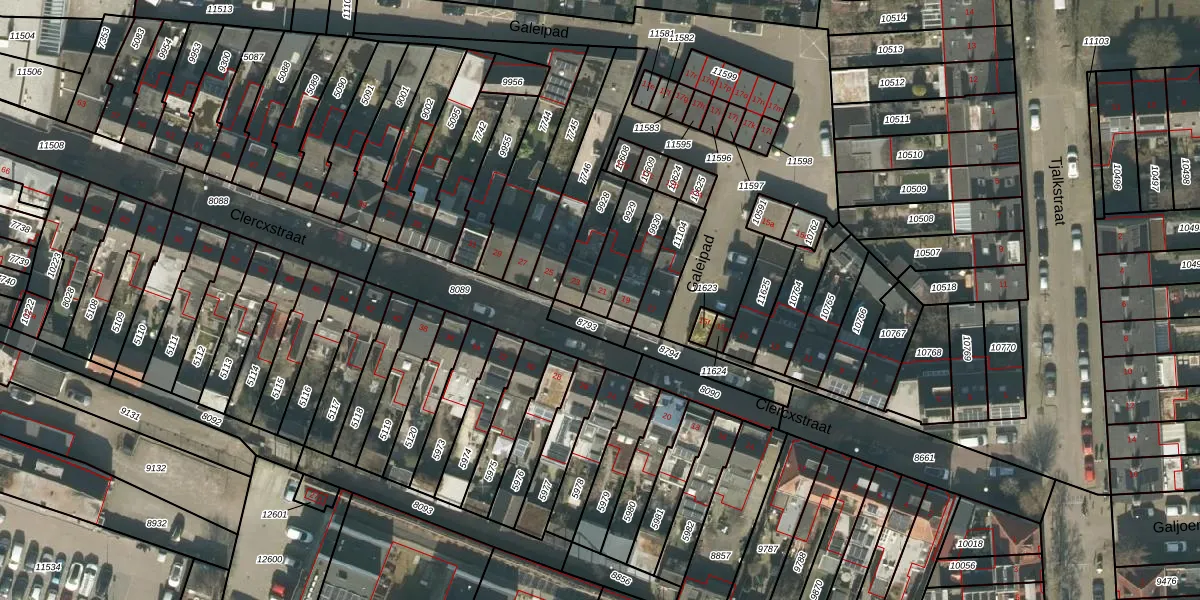Het perceel waarop Clercxstraat 21 staat heeft een oppervlakte van 106 m². Dit is een middelgroot perceel. De perceeloppervlakte wordt geregistreerd door het Kadaster. Gedetailleerde informatie over de maten van dit perceel kunt u vinden in het rapport Kadastrale kaart met maatvoering van Clercxstraat 21.