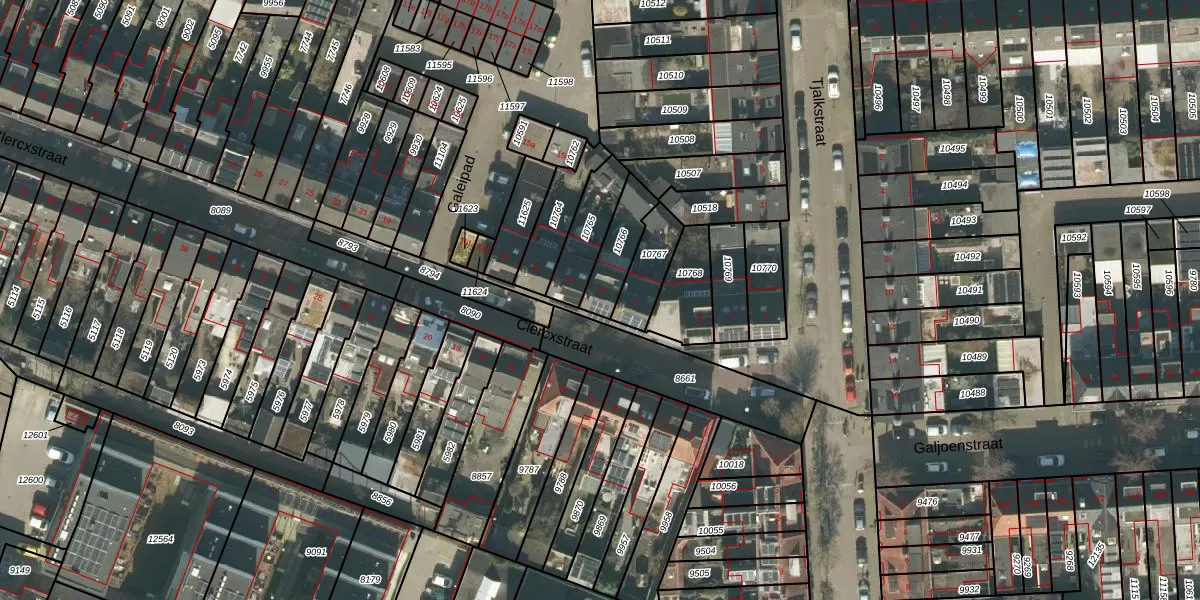 Clercxstraat 9 is gelegen op kadastraal perceel TBG01M10766. Deze kadastrale aanduiding is uniek en wordt gebruikt door het Kadaster om eigendomsrechten en andere zakelijke rechten vast te leggen. Het perceel maakt onderdeel uit van de kadastrale gemeente Tilburg.