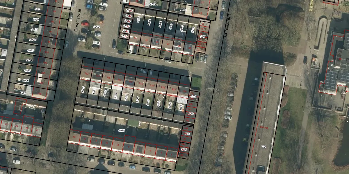 Het perceel waarop Corellistraat 127 staat heeft een oppervlakte van 172 m². Dit is een middelgroot perceel. De perceeloppervlakte wordt geregistreerd door het Kadaster. Gedetailleerde informatie over de maten van dit perceel kunt u vinden in het rapport Kadastrale kaart met maatvoering van Corellistraat 127.