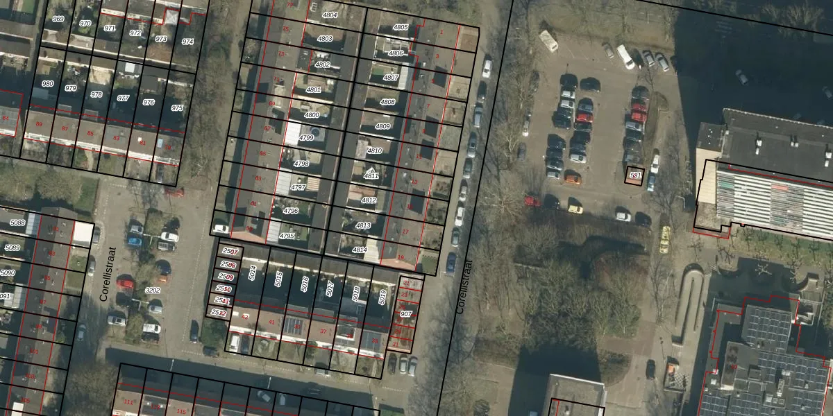 Het perceel waarop Corellistraat 15 staat heeft een oppervlakte van 166 m². Dit is een middelgroot perceel. De perceeloppervlakte wordt geregistreerd door het Kadaster. Gedetailleerde informatie over de maten van dit perceel kunt u vinden in het rapport Kadastrale kaart met maatvoering van Corellistraat 15.
