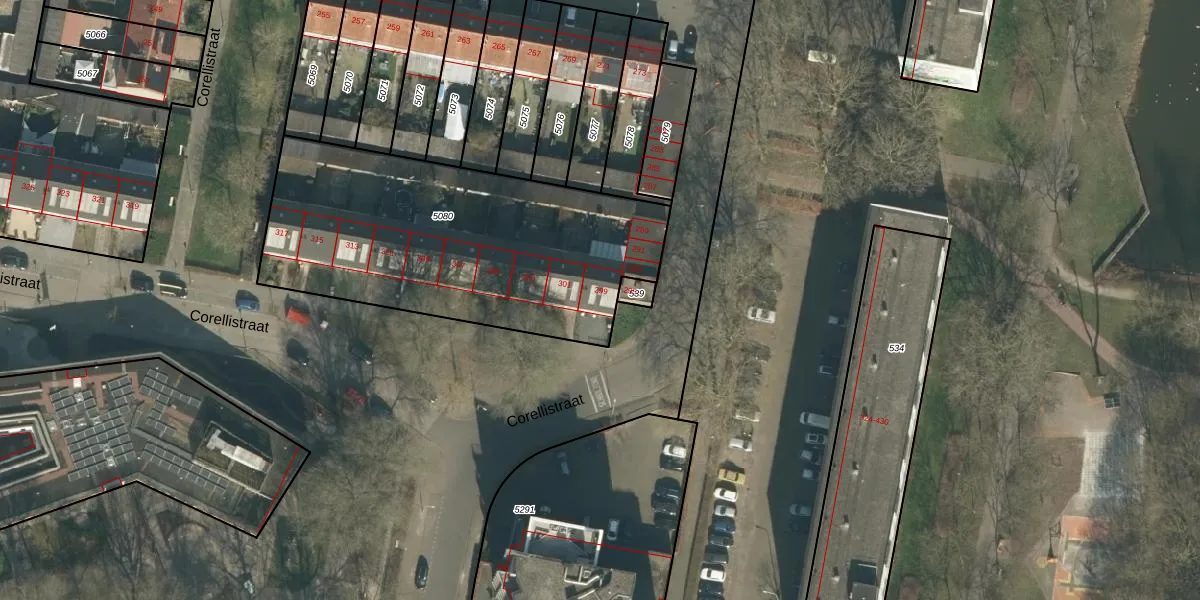 Corellistraat 299 is gelegen op kadastraal perceel TBG01S5080. Deze kadastrale aanduiding is uniek en wordt gebruikt door het Kadaster om eigendomsrechten en andere zakelijke rechten vast te leggen. Het perceel maakt onderdeel uit van de kadastrale gemeente Tilburg.
