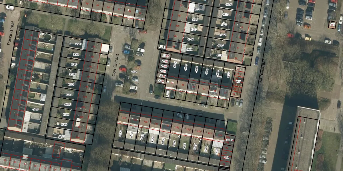 Het perceel waarop Corellistraat 43 staat heeft een oppervlakte van 180 m². Dit is een middelgroot perceel. De perceeloppervlakte wordt geregistreerd door het Kadaster. Gedetailleerde informatie over de maten van dit perceel kunt u vinden in het rapport Kadastrale kaart met maatvoering van Corellistraat 43.