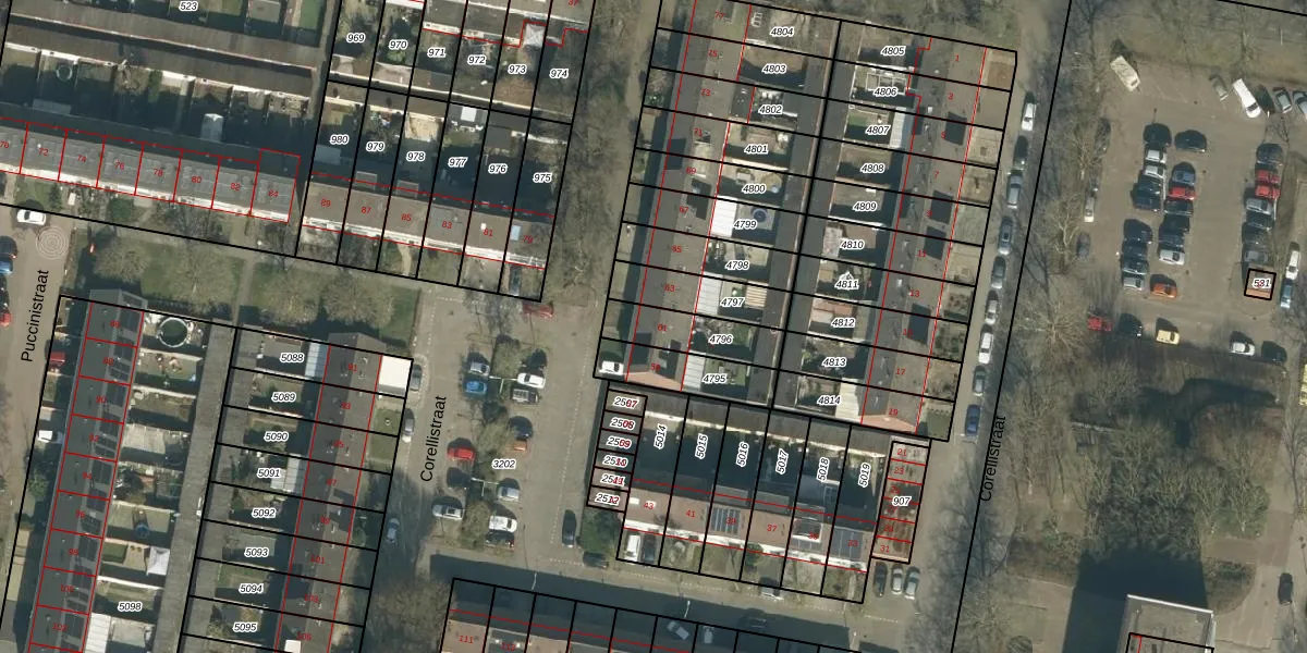 Het perceel waarop Corellistraat 61 staat heeft een oppervlakte van 166 m². Dit is een middelgroot perceel. De perceeloppervlakte wordt geregistreerd door het Kadaster. Gedetailleerde informatie over de maten van dit perceel kunt u vinden in het rapport Kadastrale kaart met maatvoering van Corellistraat 61.
