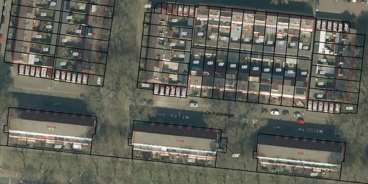 Het perceel waarop De Fallastraat 61 staat heeft een oppervlakte van 18 m². Dit is een klein perceel. De perceeloppervlakte wordt geregistreerd door het Kadaster. Gedetailleerde informatie over de maten van dit perceel kunt u vinden in het rapport Kadastrale kaart met maatvoering van De Fallastraat 61.