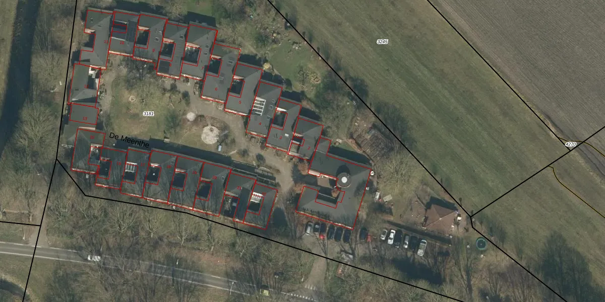 Het perceel waarop De Meenthe 2 staat heeft een oppervlakte van 9694 m². Dit is een zeer groot perceel. De perceeloppervlakte wordt geregistreerd door het Kadaster. Gedetailleerde informatie over de maten van dit perceel kunt u vinden in het rapport Kadastrale kaart met maatvoering van De Meenthe 2.