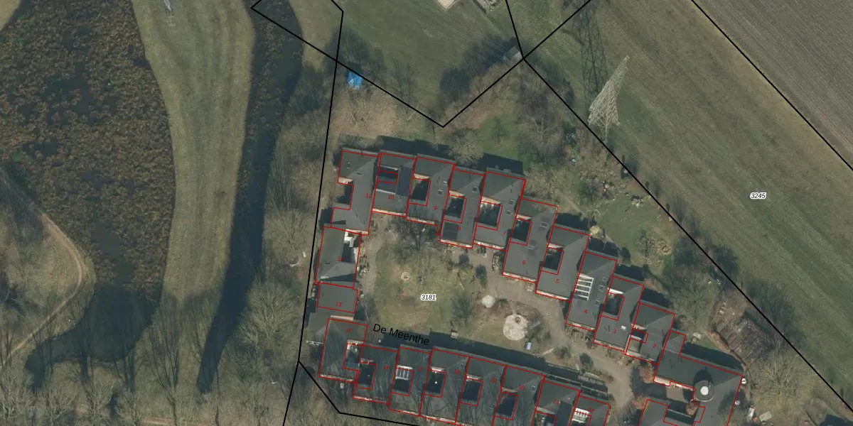 Het perceel waarop De Meenthe 9 staat heeft een oppervlakte van 9694 m². Dit is een zeer groot perceel. De perceeloppervlakte wordt geregistreerd door het Kadaster. Gedetailleerde informatie over de maten van dit perceel kunt u vinden in het rapport Kadastrale kaart met maatvoering van De Meenthe 9.