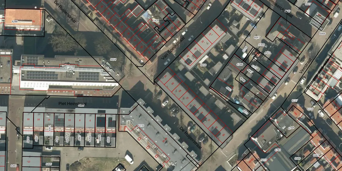 De Ruijterstraat 66 is gelegen op kadastraal perceel TBG01R6658. Deze kadastrale aanduiding is uniek en wordt gebruikt door het Kadaster om eigendomsrechten en andere zakelijke rechten vast te leggen. Het perceel maakt onderdeel uit van de kadastrale gemeente Tilburg.