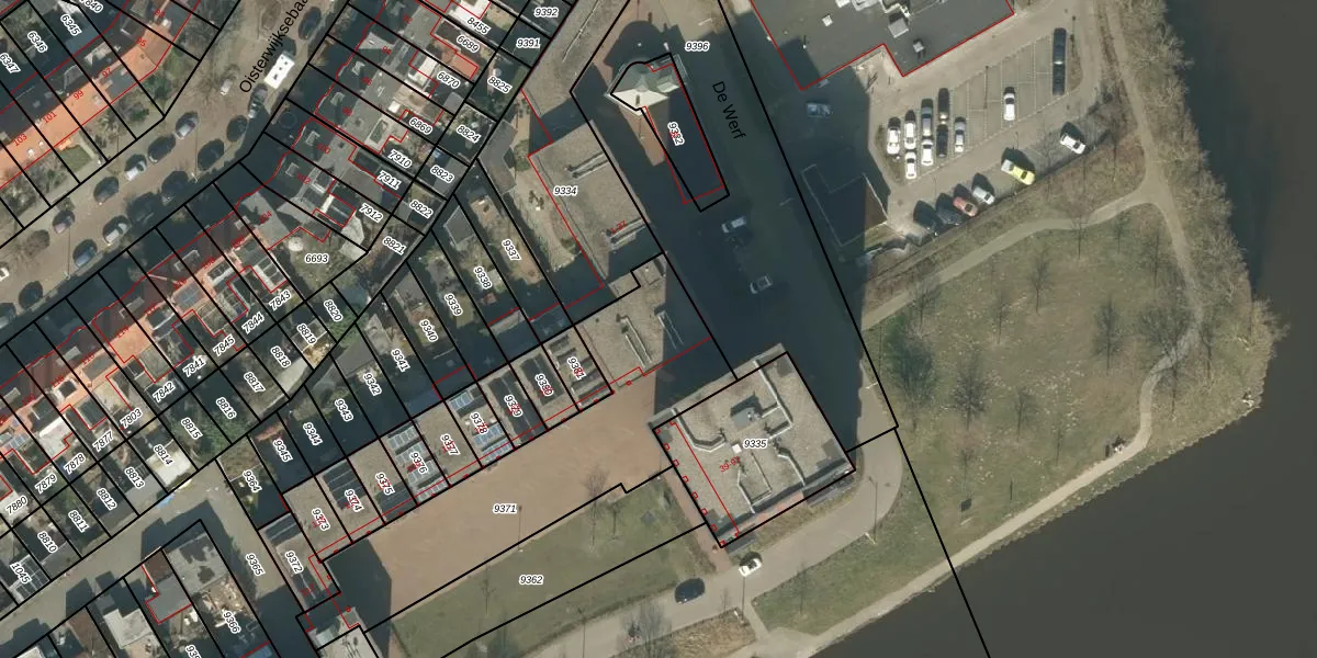 Het perceel waarop De Werf 37 staat heeft een oppervlakte van 1076 m². Dit is een zeer groot perceel. De perceeloppervlakte wordt geregistreerd door het Kadaster. Gedetailleerde informatie over de maten van dit perceel kunt u vinden in het rapport Kadastrale kaart met maatvoering van De Werf 37.