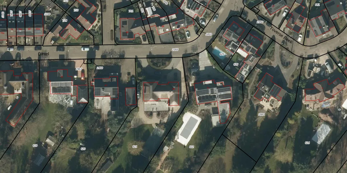 Het perceel waarop Dintel 49 staat heeft een oppervlakte van 2958 m². Dit is een zeer groot perceel. De perceeloppervlakte wordt geregistreerd door het Kadaster. Gedetailleerde informatie over de maten van dit perceel kunt u vinden in het rapport Kadastrale kaart met maatvoering van Dintel 49.