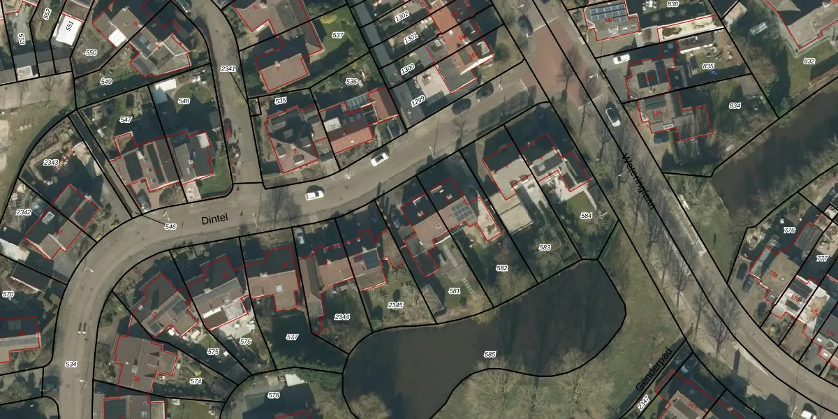 Het perceel waarop Dintel 8 staat heeft een oppervlakte van 447 m². Dit is een groot perceel. De perceeloppervlakte wordt geregistreerd door het Kadaster. Gedetailleerde informatie over de maten van dit perceel kunt u vinden in het rapport Kadastrale kaart met maatvoering van Dintel 8.