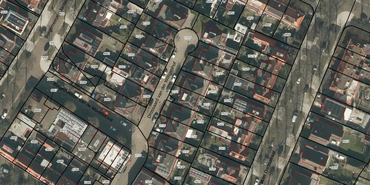 Drossaard van der Willigenhof 13 is gelegen op kadastraal perceel TBG01P7713. Deze kadastrale aanduiding is uniek en wordt gebruikt door het Kadaster om eigendomsrechten en andere zakelijke rechten vast te leggen. Het perceel maakt onderdeel uit van de kadastrale gemeente Tilburg.