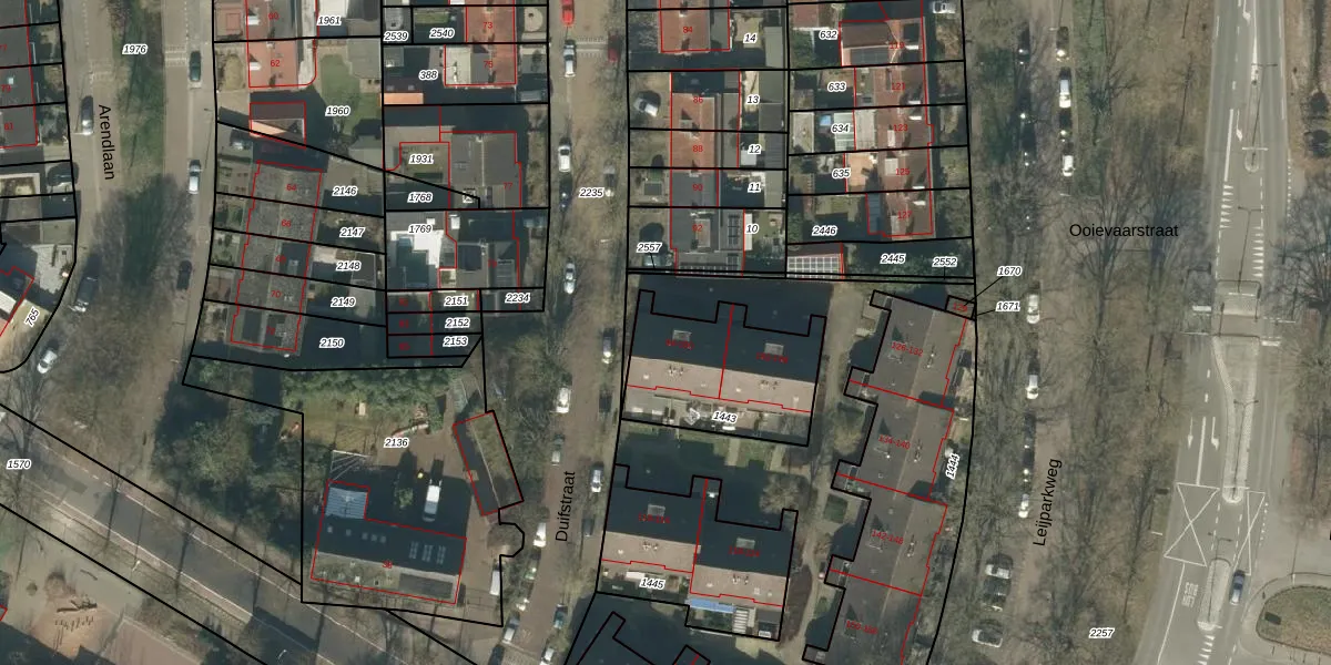 Het perceel waarop Duifstraat 96 staat heeft een oppervlakte van 495 m². Dit is een groot perceel. De perceeloppervlakte wordt geregistreerd door het Kadaster. Gedetailleerde informatie over de maten van dit perceel kunt u vinden in het rapport Kadastrale kaart met maatvoering van Duifstraat 96.