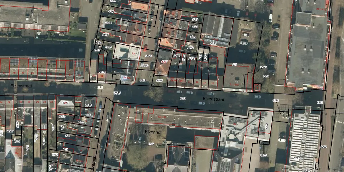 Elzenstraat 25 is gelegen op kadastraal perceel TBG01P6218. Deze kadastrale aanduiding is uniek en wordt gebruikt door het Kadaster om eigendomsrechten en andere zakelijke rechten vast te leggen. Het perceel maakt onderdeel uit van de kadastrale gemeente Tilburg.