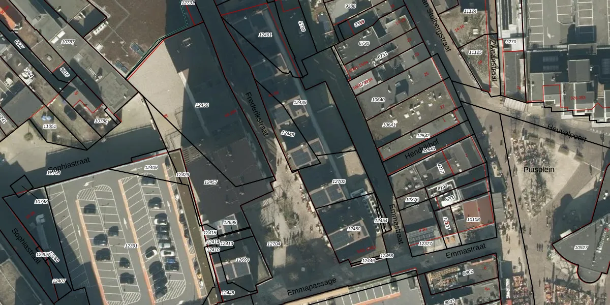 Emmapassage 13-03 is gelegen op kadastraal perceel TBG01M12445. Deze kadastrale aanduiding is uniek en wordt gebruikt door het Kadaster om eigendomsrechten en andere zakelijke rechten vast te leggen. Het perceel maakt onderdeel uit van de kadastrale gemeente Tilburg.