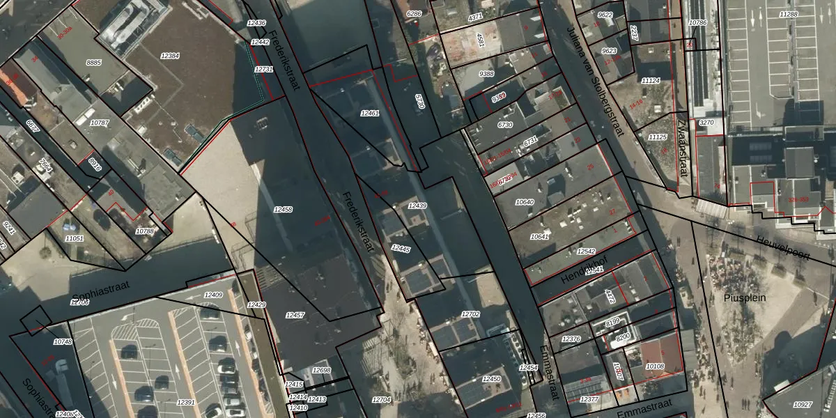 Emmapassage 9-10 is gelegen op kadastraal perceel TBG01M12439. Deze kadastrale aanduiding is uniek en wordt gebruikt door het Kadaster om eigendomsrechten en andere zakelijke rechten vast te leggen. Het perceel maakt onderdeel uit van de kadastrale gemeente Tilburg.