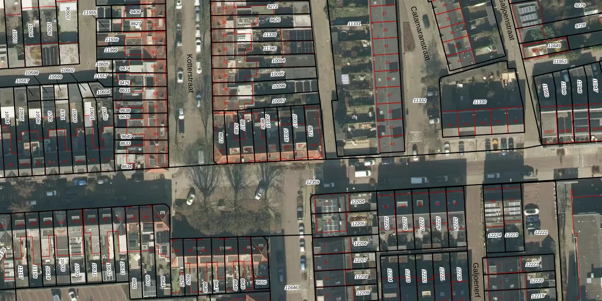 Het perceel waarop Galjoenstraat 67 staat heeft een oppervlakte van 79 m². Dit is een klein perceel. De perceeloppervlakte wordt geregistreerd door het Kadaster. Gedetailleerde informatie over de maten van dit perceel kunt u vinden in het rapport Kadastrale kaart met maatvoering van Galjoenstraat 67.
