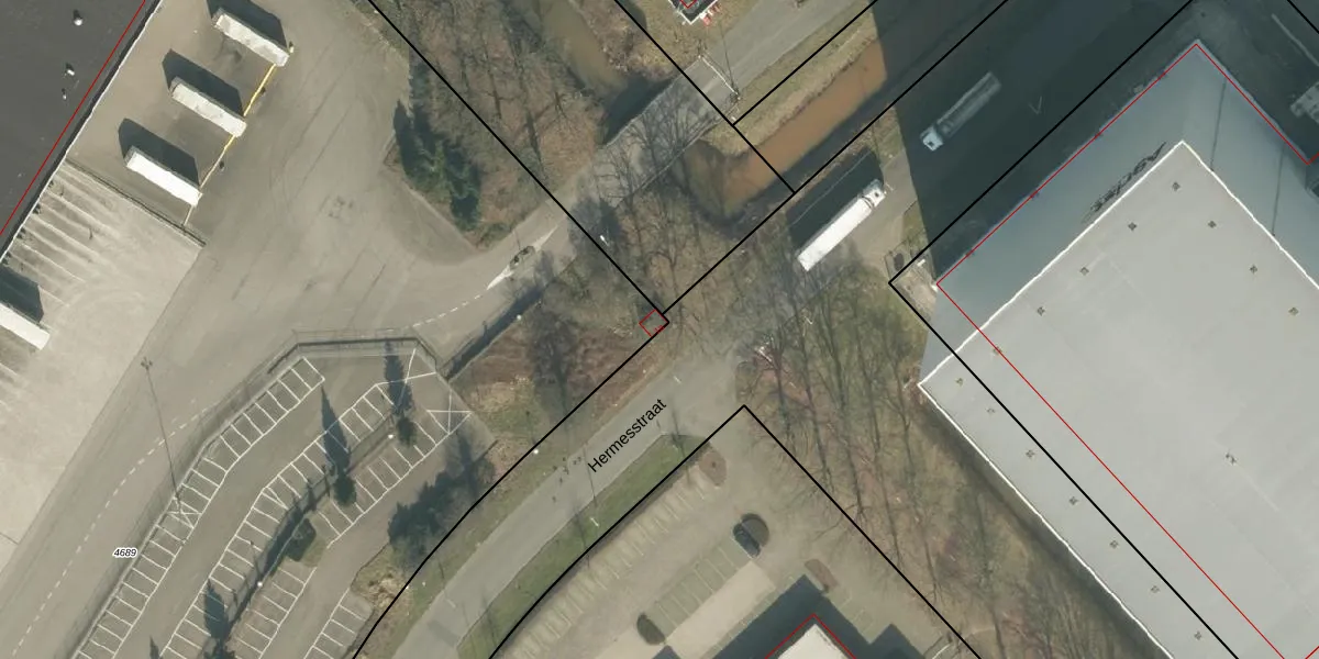 Het perceel waarop Hermesstraat 1-a staat heeft een oppervlakte van 5,1 ha. Dit is een zeer groot perceel. De perceeloppervlakte wordt geregistreerd door het Kadaster. Gedetailleerde informatie over de maten van dit perceel kunt u vinden in het rapport Kadastrale kaart met maatvoering van Hermesstraat 1-a.