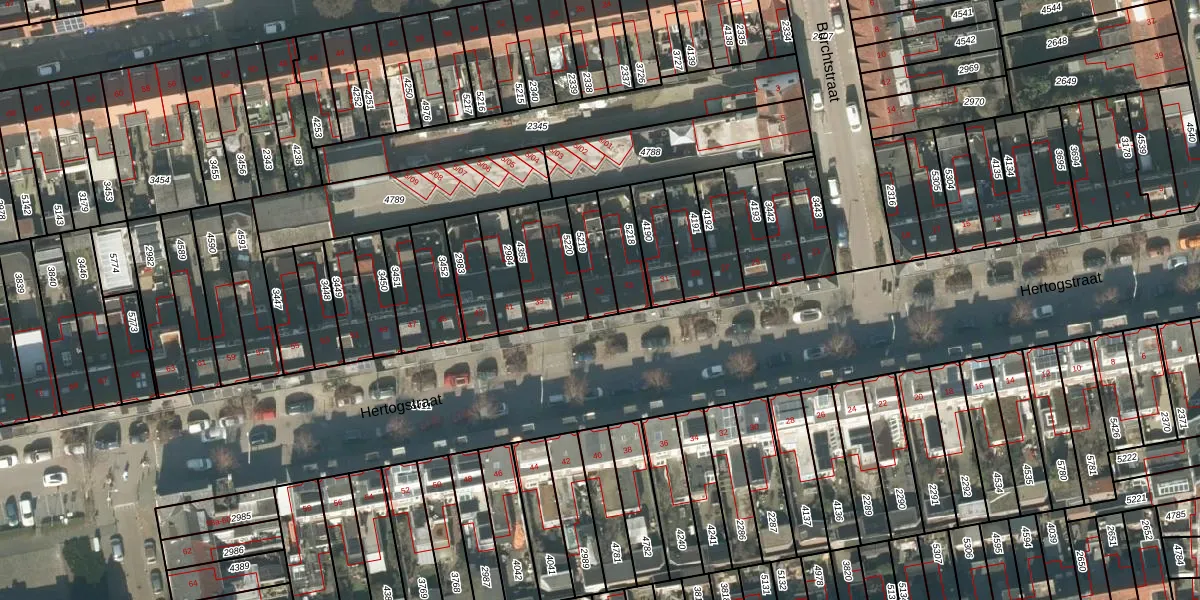 Het perceel waarop Hertogstraat 35 staat heeft een oppervlakte van 107 m². Dit is een middelgroot perceel. De perceeloppervlakte wordt geregistreerd door het Kadaster. Gedetailleerde informatie over de maten van dit perceel kunt u vinden in het rapport Kadastrale kaart met maatvoering van Hertogstraat 35.