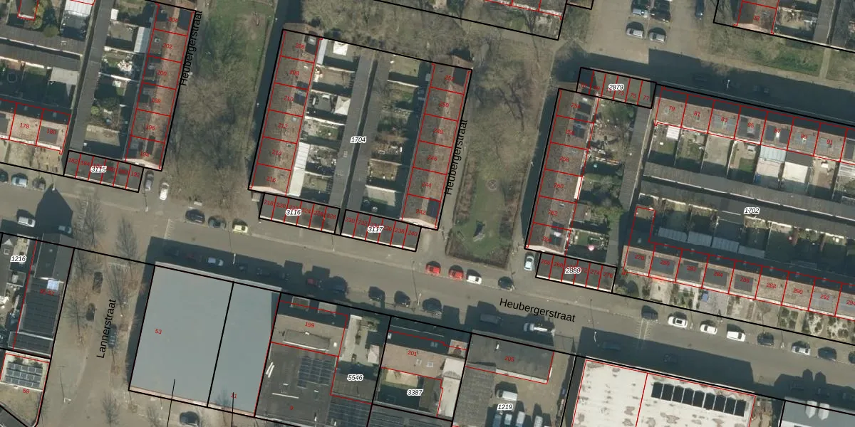 Het perceel waarop Heubergerstraat 242 staat heeft een oppervlakte van 1734 m². Dit is een zeer groot perceel. De perceeloppervlakte wordt geregistreerd door het Kadaster. Gedetailleerde informatie over de maten van dit perceel kunt u vinden in het rapport Kadastrale kaart met maatvoering van Heubergerstraat 242.