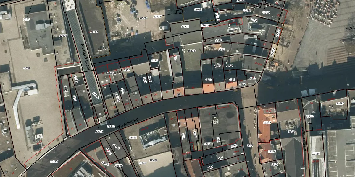 Heuvelstraat 13 is gelegen op kadastraal perceel TBG01M5300. Deze kadastrale aanduiding is uniek en wordt gebruikt door het Kadaster om eigendomsrechten en andere zakelijke rechten vast te leggen. Het perceel maakt onderdeel uit van de kadastrale gemeente Tilburg.