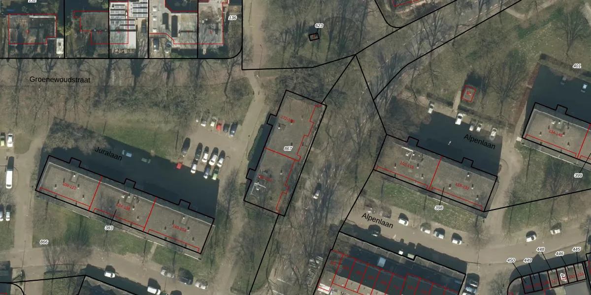 Het perceel waarop Juralaan 182 staat heeft een oppervlakte van 605 m². Dit is een groot perceel. De perceeloppervlakte wordt geregistreerd door het Kadaster. Gedetailleerde informatie over de maten van dit perceel kunt u vinden in het rapport Kadastrale kaart met maatvoering van Juralaan 182.