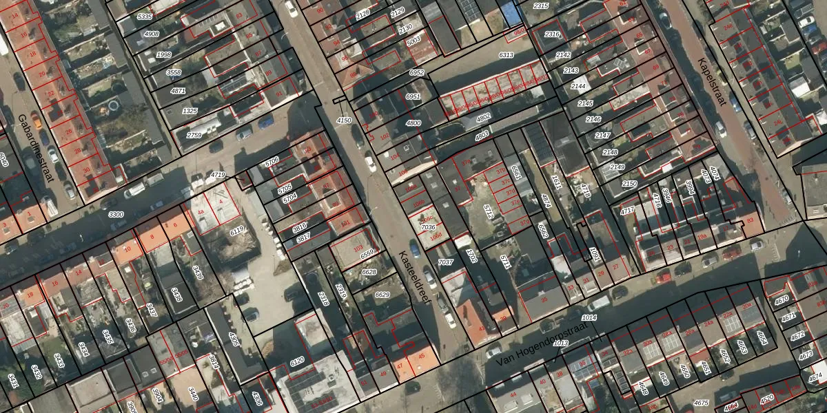 Kasteeldreef 106-b is gelegen op kadastraal perceel TBG01O7036. Deze kadastrale aanduiding is uniek en wordt gebruikt door het Kadaster om eigendomsrechten en andere zakelijke rechten vast te leggen. Het perceel maakt onderdeel uit van de kadastrale gemeente Tilburg.