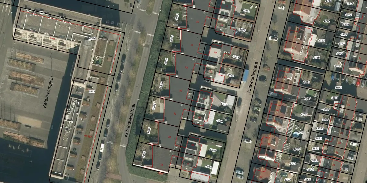 Katwoudestraat 25 is gelegen op kadastraal perceel TBG01AF5905. Deze kadastrale aanduiding is uniek en wordt gebruikt door het Kadaster om eigendomsrechten en andere zakelijke rechten vast te leggen. Het perceel maakt onderdeel uit van de kadastrale gemeente Tilburg.