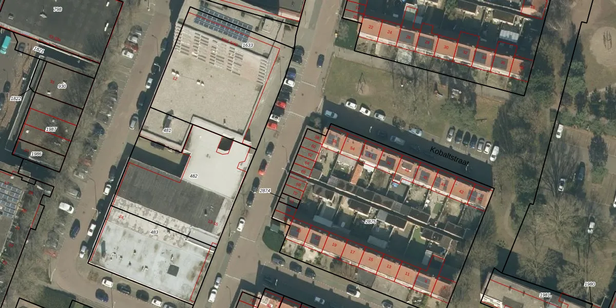 Het perceel waarop Kobaltstraat 62 staat heeft een oppervlakte van 2757 m². Dit is een zeer groot perceel. De perceeloppervlakte wordt geregistreerd door het Kadaster. Gedetailleerde informatie over de maten van dit perceel kunt u vinden in het rapport Kadastrale kaart met maatvoering van Kobaltstraat 62.