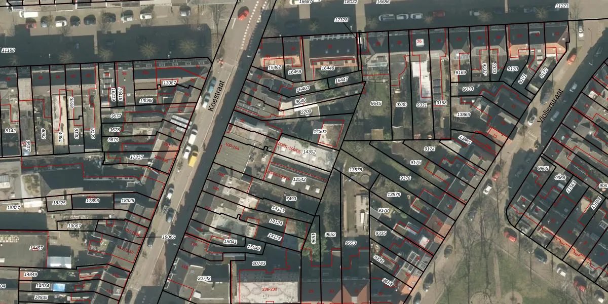 Het perceel waarop Koestraat 100-03 staat heeft een oppervlakte van 225 m². Dit is een middelgroot perceel. De perceeloppervlakte wordt geregistreerd door het Kadaster. Gedetailleerde informatie over de maten van dit perceel kunt u vinden in het rapport Kadastrale kaart met maatvoering van Koestraat 100-03.