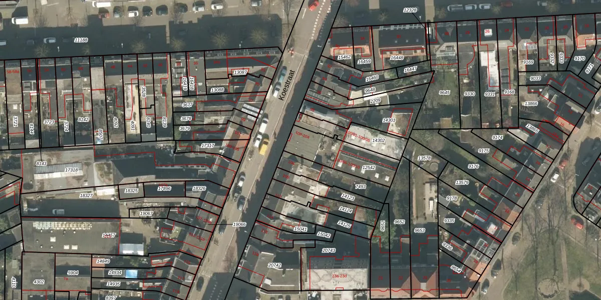 Het perceel waarop Koestraat 104 staat heeft een oppervlakte van 357 m². Dit is een groot perceel. De perceeloppervlakte wordt geregistreerd door het Kadaster. Gedetailleerde informatie over de maten van dit perceel kunt u vinden in het rapport Kadastrale kaart met maatvoering van Koestraat 104.