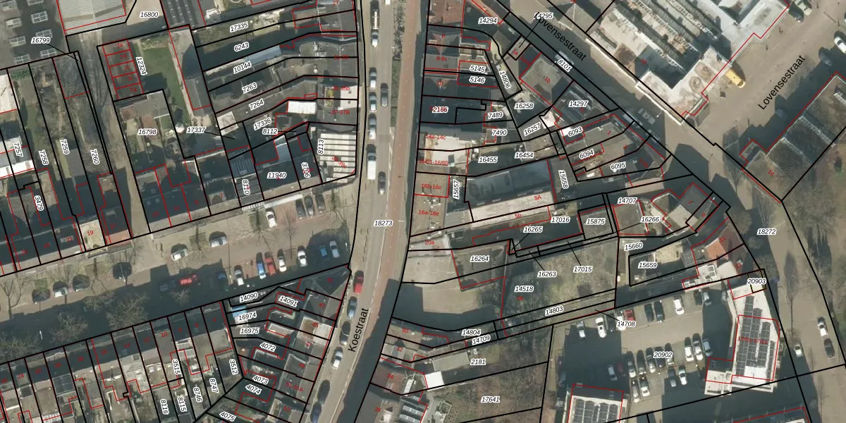 Koestraat 18-b is gelegen op kadastraal perceel TBG01N15657. Deze kadastrale aanduiding is uniek en wordt gebruikt door het Kadaster om eigendomsrechten en andere zakelijke rechten vast te leggen. Het perceel maakt onderdeel uit van de kadastrale gemeente Tilburg.