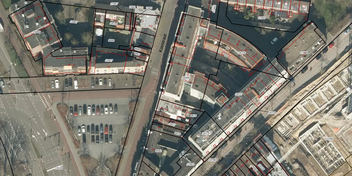Het perceel waarop Koestraat 230 staat heeft een oppervlakte van 1237 m². Dit is een zeer groot perceel. De perceeloppervlakte wordt geregistreerd door het Kadaster. Gedetailleerde informatie over de maten van dit perceel kunt u vinden in het rapport Kadastrale kaart met maatvoering van Koestraat 230.