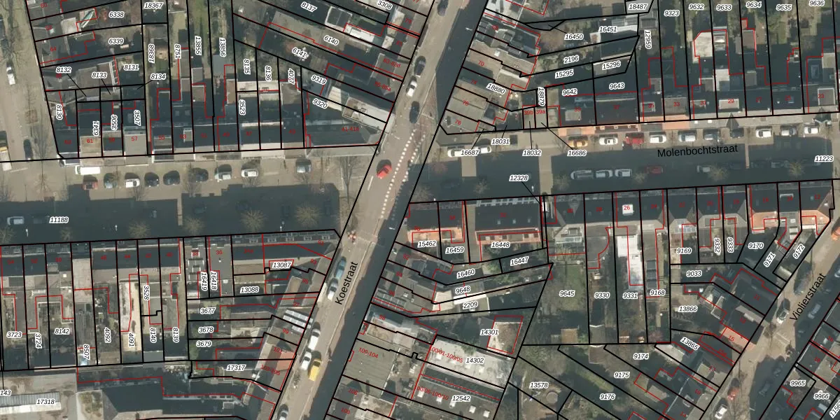 Het perceel waarop Koestraat 90 staat heeft een oppervlakte van 98 m². Dit is een klein perceel. De perceeloppervlakte wordt geregistreerd door het Kadaster. Gedetailleerde informatie over de maten van dit perceel kunt u vinden in het rapport Kadastrale kaart met maatvoering van Koestraat 90.
