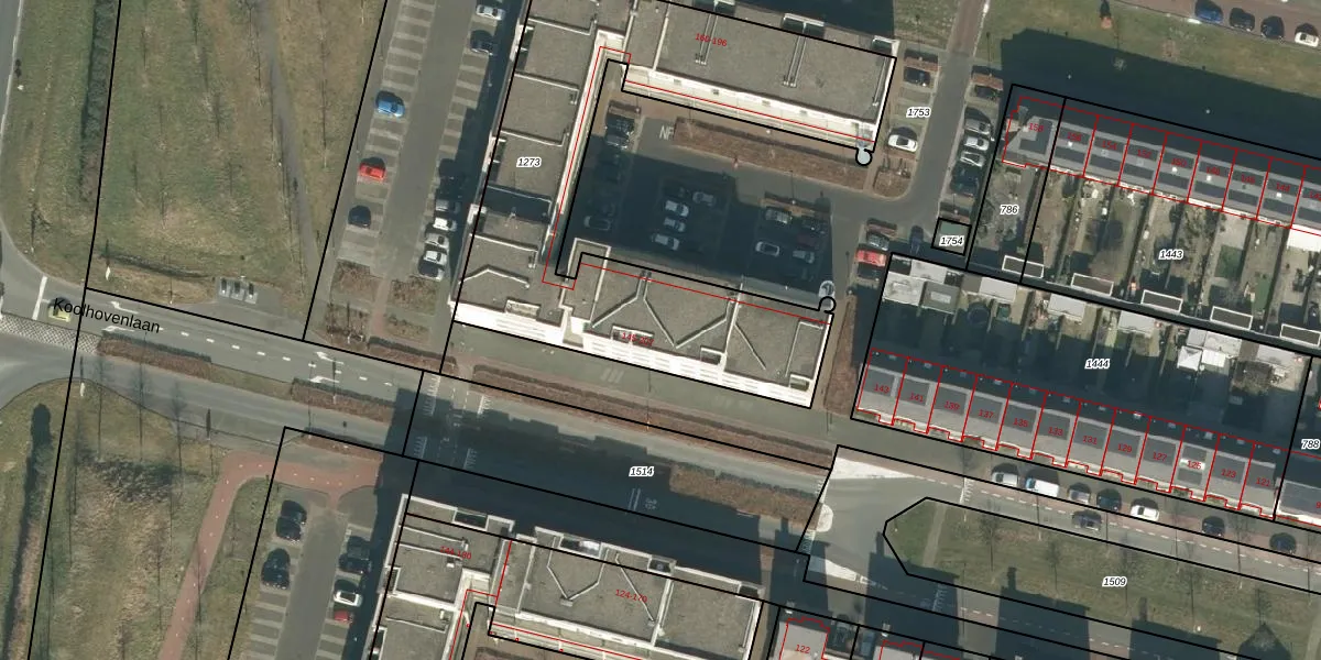 Het perceel waarop Koolhovenlaan 187 staat heeft een oppervlakte van 1960 m². Dit is een zeer groot perceel. De perceeloppervlakte wordt geregistreerd door het Kadaster. Gedetailleerde informatie over de maten van dit perceel kunt u vinden in het rapport Kadastrale kaart met maatvoering van Koolhovenlaan 187.