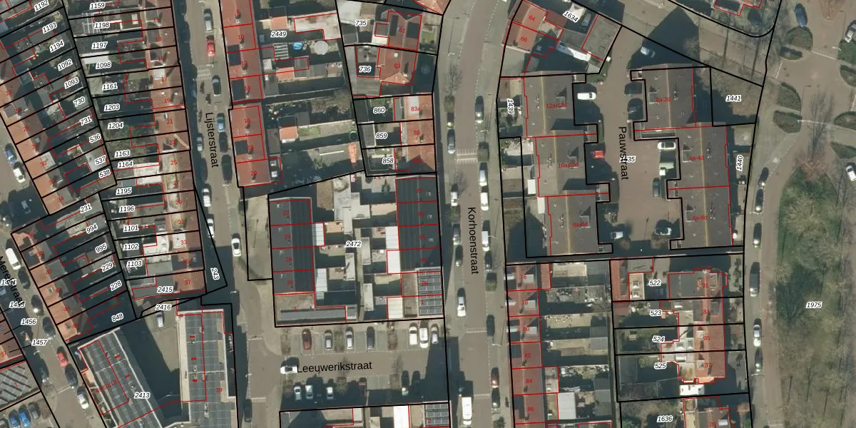 Het perceel waarop Korhoenstraat 89 staat heeft een oppervlakte van 1325 m². Dit is een zeer groot perceel. De perceeloppervlakte wordt geregistreerd door het Kadaster. Gedetailleerde informatie over de maten van dit perceel kunt u vinden in het rapport Kadastrale kaart met maatvoering van Korhoenstraat 89.